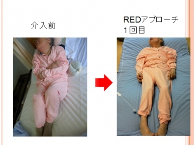<研究から生まれたアプローチ> 近年、身体質量と重力を拮抗させた環境で行うポジショニングアプローチを行う事で、筋緊張が安定し、関節拘縮の変化と長時間持続する臨床研究が発表されました。ニュートン物理学、第三法則、作用-反作用の法則の、反作用を限りなく小さくするという、微小重力相対性理論の仮説を実証した結果で、低反撥マットレスを数枚重ねてポジショニングを行うことで仮説の立証に成功しました。この環境をRehabilitation & Engineering Design -R.E.D.-とし、2010年より研究が開始されました。 身体にかかる重力が小さくなり、収縮の必然性がなくなる筋、腱は、柔軟性を取り戻し、神経や感覚入力と相互作用していきます。変化した身体状況は自律神経系の安定(副交感神経優位)や呼吸、循環へと波及し、過緊張、低緊張など異常筋緊張の安定に結びついていきます。 代表的な例として、長期療養生活を送る、長い年月をかけてもたらされた過緊張や関節拘縮の変化と循環器系の安定例は、これまでの臨床場面では見られなかった新しい発見と、今後の医療に大きく影響する事が示唆されました。低反撥マットレスを身体質量の比重に合わせて積層する環境設定という単純性は、高い再現性と介入者要因に依存しない筋緊張制御となり、誰が介入しても同じ結果となります。このような現象、結果の蓄積により関節拘縮の概念をも、確実に変える力を持っています。 また、このような筋組織の変化と過緊張、低緊張など異常筋緊張の安定、重度の呼吸器疾患、心疾患患者の心拍数、呼吸数、血中酸素飽和度、血圧の安定は、ワッサーマンの歯車に代表される、筋、呼吸、循環の効率と、三者に対し、同時に介入し結果を出した背景が否めず、内部障害への新たなアプローチとしても期待されています。 この研究結果を数年にわたり、当学会以外の全国の著名学会に発表、共有し、2015年5月に理学療法の全国学会、6月には、作業療法の世界学会にも、2演題の演題採択がされています。医療、医学に携わる日本全国、世界各国の査読者が認めた事実を皆さんと共有すると共に、研究に用いた物品ではなく、臨床現場にあるものだけで結果を残す具体的方法論や、明日からすぐに使え臨床に役立てるポジショニング技術や、在宅介護でのポジショニングの応用をご提案します。