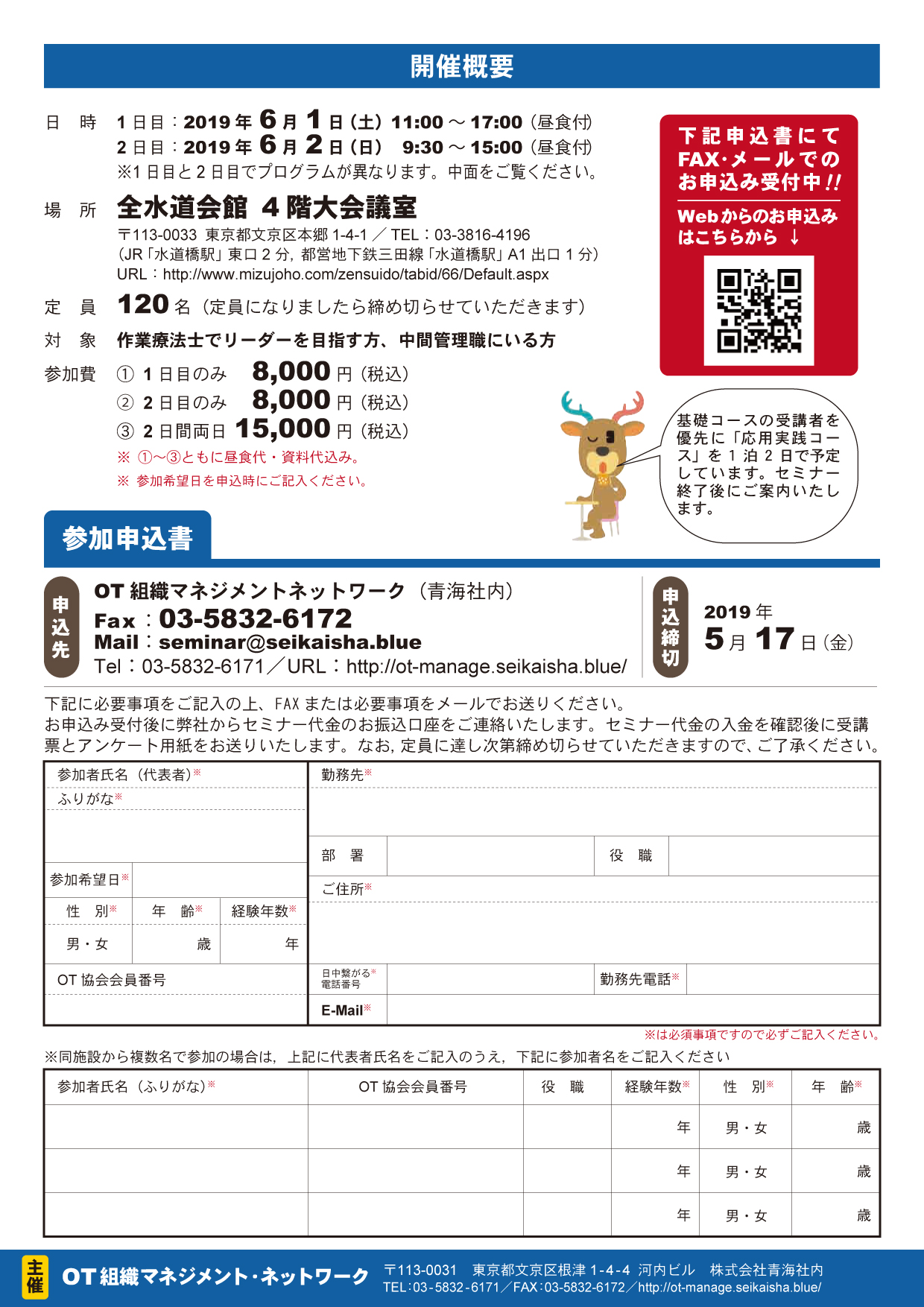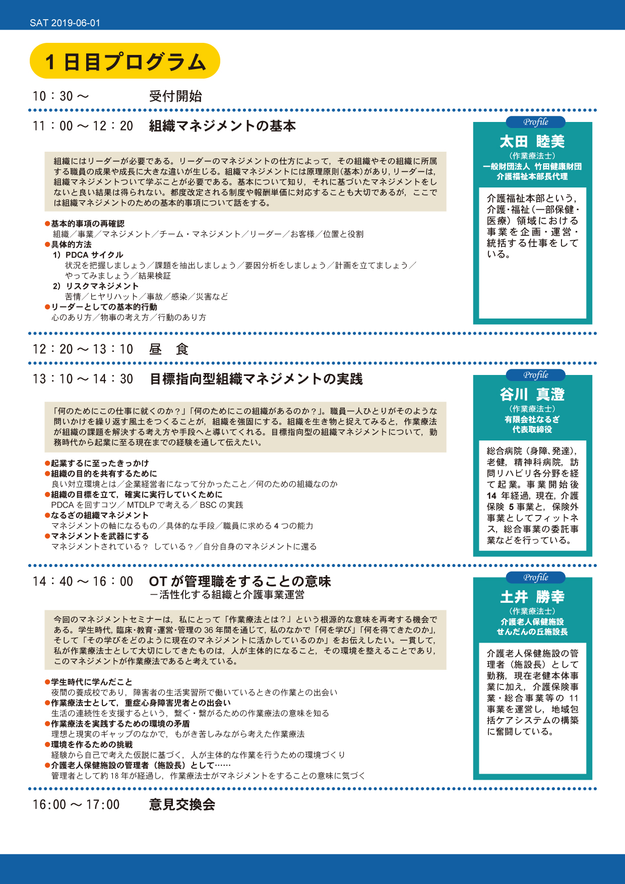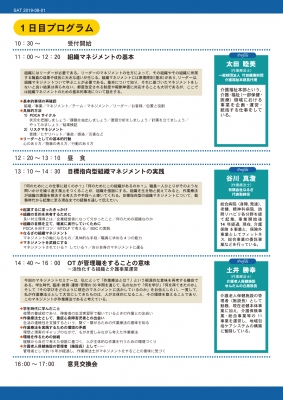 組織マネジメントは作業療法そのものです。作業療法士で、今、中間管理職で悩んでいる方、これからリーダーになろうとしている方が、マネジメントをどう考え、どのように展開すればよいのか、具体的に学べるセミナーです。作業療法のバックボーンがあるからこそ、医療スタッフにも作業療法でより良い環境を提供することができます。組織マネジメントを実際の経験に沿ってより深め、実践力に結びつける内容です。一流の講師陣が組織マネジメントを分かりやすく説明します。現場の疑問点に応えるプログラムも用意しています。多くの人と交流し、疑問点や悩みを解決できる場を提供します。頭で考えるよりまず行動を、広がりの輪が新しい世界を創出するように。