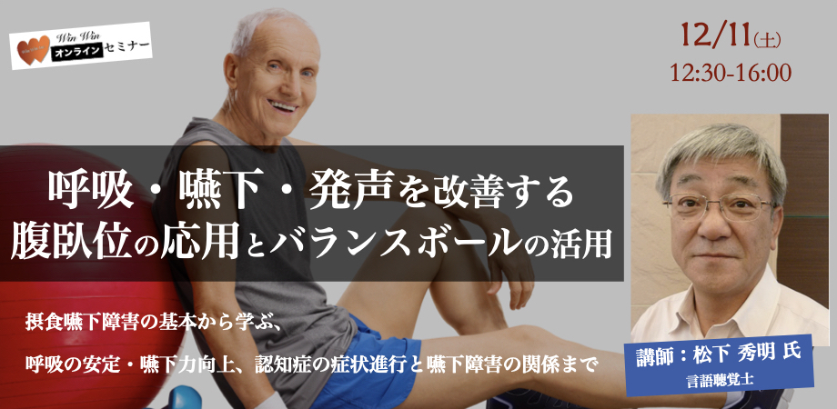 【内容】 本セミナーは、摂食嚥下障害者へ『安全に・美味しく・安楽に』口から食べられることを目的に、『呼吸の安定』『嚥下力の向上』、そして、『関節可動域の改善』を、誰でもできる腹臥位の応用とバランスボールを活用してのアプローチ法と『口腔リハビリ』のポイントを講義とデモを交えながらわかりやすく身につけていきます。 また、施設・在宅で多くみられる認知症患者さんの症状進行(初期、中期、末期、終末期)を摂食嚥下障害の基本からアプローチのポイントを学びます。