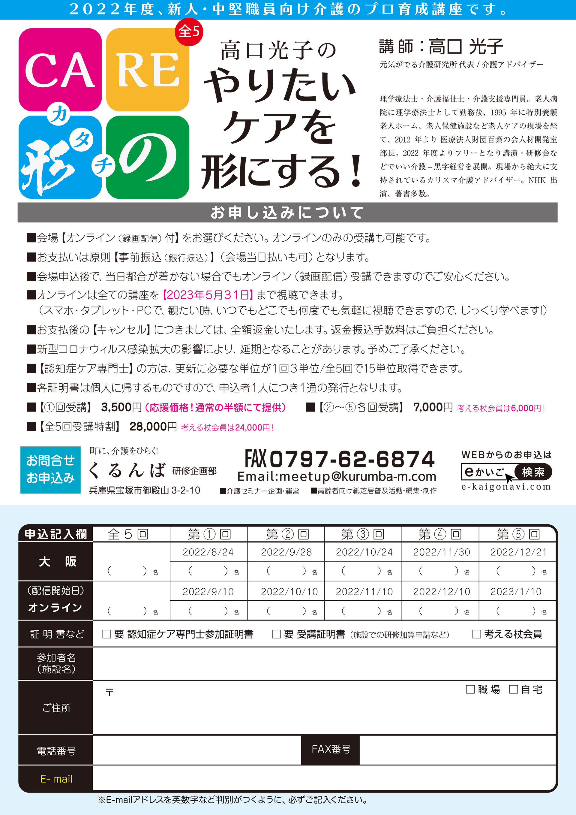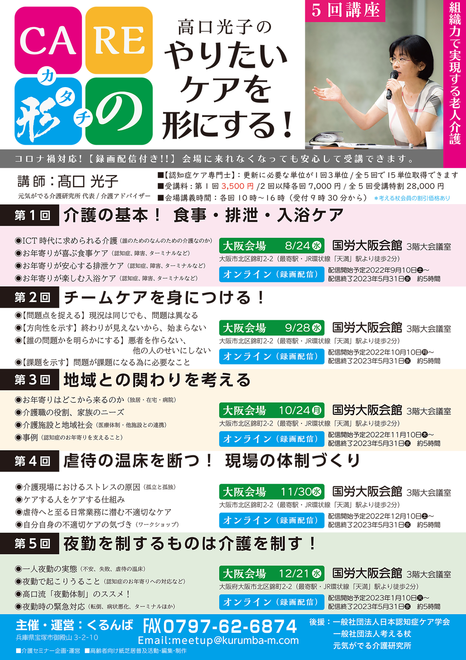 業務改善、人材育成と数々の介護現場を変えてきた髙口光子先生の最新の【介護のプロ育成講座】です! *動画は2022年8月〜2022年12月に撮影収録した最新の動画となります。