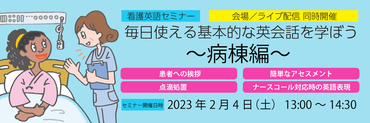 病棟の業務の中では、挨拶、説明、指示を患者の状況に応じて行います。 このような場面で、外国人患者にはどう伝えたら良いでしょう? たとえば、ナースコールで呼ばれたら「すぐに伺います。」と返事をしますよね。 それを英語では何と言うのでしょうか。 ”I’ll go there.”で正確に伝わるでしょうか。 ”I’m coming.”はどうでしょう。 実はより適切な表現があるのです。 セミナー前半では、病棟での基本的な看護業務(患者への挨拶、簡単なアセスメント、点滴処置、ナースコールへの対応)が円滑にすすめられるように、効果的な英語表現を学習していきます。 セミナー後半ではスピーキング練習を中心に、教師が1人1人の発音や、イントネーションを確認していきます。 初級者の方々でも安心してご受講いただけます。 担当は、カナダと日本の両方の看護師資格を持ち、カナダでの勤務経験がある日本人の教師です。 受講方法は、会場受講、もしくはZoomによるライブ配信受講、どちらかご都合の良い方をお選びいただけます。 病棟で毎日使える英会話を、今日から看護現場で活かしましょう! ※新型コロナウイルス感染症の状況に応じて、対応を今後変更する(ライブ配信受講のみ)場合もございます。 当協会のホームページで最新の情報をご確認ください。
