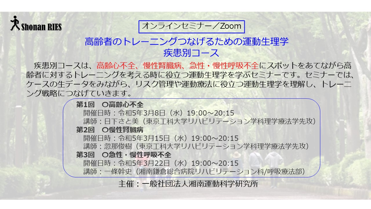 疾患別コースは、高齢心不全、慢性腎臓病、急性・慢性呼吸不全にスポットをあてながら高齢者に対するトレーニングを考える時に役立つ運動生理学を学ぶセミナーです。セミナーでは、ケースの生データをみながら、リスク管理や運動療法に役立つ運動生理学を理解し、トレーニング戦略につなげていきます。 第1回 〇高齢心不全 開催日時:令和5年3月8日(水)19:00~20:15 内容:高齢心不全療養者(患者)の運動負荷につなげるための運動生理学の復習と日常生活を考える。 講師:日下さと美(東京工科大学医療保健学部リハビリテーション学科理学療法学先攻) 第2回 〇慢性腎臓病 開催日時:令和5年3月15日(水)19:00~20:15 内容:運動時の腎機能やバイタルサインの変化に着目し、慢性腎臓病者のトレーニング戦略を病期別に考える。 講師:忽那俊樹(東京工科大学医療保健学部リハビリテーション学科理学療法学先攻) 第3回 〇急性・慢性呼吸不全 開催日時:令和5年3月22日(水)19:00~20:15 内容:呼吸不全患者へ適切な運動(療法)を提供するための呼吸生理学・運動生理学の要点を説明する。 講師:一條幹史(湘南鎌倉総合病院リハビリテーション科/呼吸療法部) <内容詳細> 1.高齢心不全 高齢心不全療養者(患者)は、低体力/虚弱かつ合併症も多い特徴があります。日常、どのくらい運動をさせていいか分からない、運動が強すぎるのではないか、血圧が低すぎるのではないかなどの疑問を抱くことや、高齢者施設に入所する高齢心不全療養者の生活では強い負荷がかかることはないのではないか、と質問を受けた経験はありませんか。我々は運動負荷を通じて心臓の働きをみています。そのためにもエネルギー代謝を中心とした運動生理学を復習して、運動負荷の方法・生活管理について考えてみたいと思います。 2.慢性腎臓病 わが国の慢性腎臓病者は約1,480万人と推計されており、約35万人が慢性透析療法を受けています(それぞれ2015年と2020年の統計)。2022年4月には「透析時運動指導等加算」が認められ、慢性腎臓病者に対する運動(運動療法)はますます注目を集めています。慢性腎臓病者の運動は長らく推奨されてこなかった歴史的経緯もあり、運動生理学との関係を含めて学習する機会は多くありませんでした。本講義では、保存期の慢性腎臓病から末期腎不全(慢性透析療法)までの病期別に考慮すべき点について触れながら、トレーニング戦略を考えたいと思います。 3.急性・慢性呼吸不全 呼吸リハビリテーションは、呼吸困難、運動耐容能、不安や抑うつを改善、健康関連QOLや健康状態を向上させ、入院を予防するエビデンスの確立された治療介入です。呼吸リハビリテーションの中心的構成要素は運動療法であり、呼吸不全患者に対する運動(療法)は標準治療の一部として認識されつつあります。一方で、臨床において呼吸困難感や低酸素血症などの症状を有する呼吸不全患者への適切な運動(療法)の提供は一筋縄ではいかないのが実情ではないでしょうか。本講義では、呼吸不全患者を理解し呼吸不全患者へ適切な運動(療法)を提供するために理解すべき呼吸のメカニズム・呼吸と運動の関係を基礎から復習していきたいと思います。