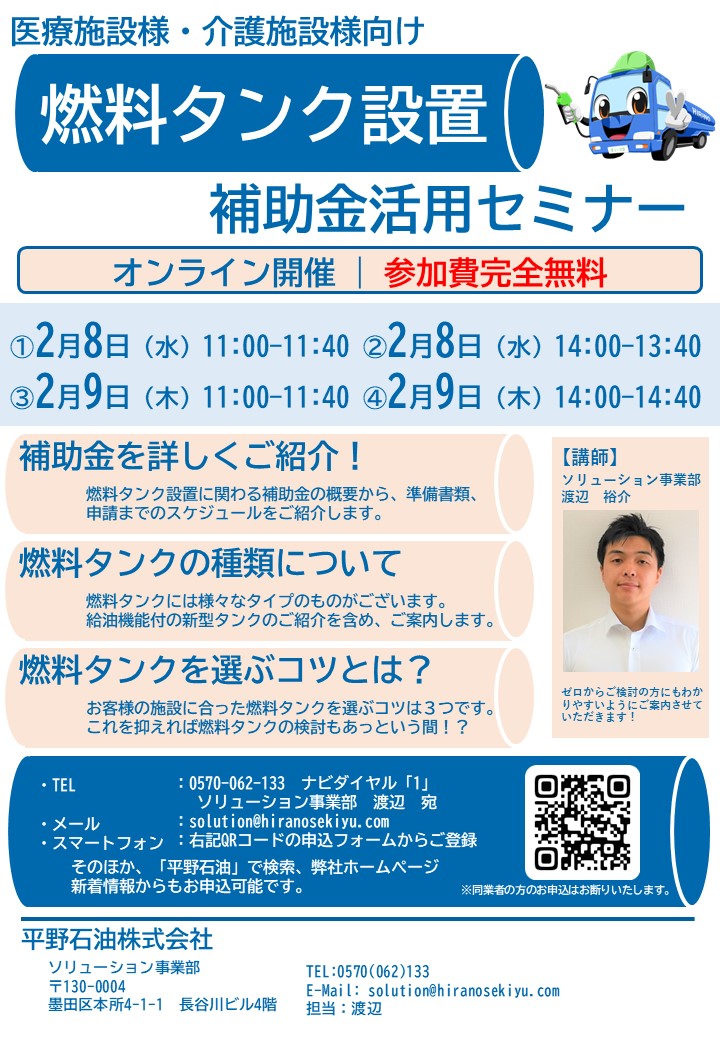 災害時に向けて、発電機用の燃料タンクを設置したいとお考えの医療・福祉施設様向けの無料セミナーです。 ↓セミナーお申し込み↓ https://attendee.bizibl.tv/sessions/se0GFNaYc3lm 2022年度の補正予算により、医療・福祉施設を対象として燃料タンク設置費用の1/2~2/3の補助金交付が決定いたしました。 補助率が高く、施設様の導入検討を前進させる機会かと存じます。 しかし… ■補助金の手続きが面倒そう…何から始めればよいの? ■申請まで時間がかかりそう、人手を割く時間が無い… ■燃料タンクのメンテナンスにもお金がかかるんでしょ? 等、ご心配や疑問があるのではないでしょうか。 今回のセミナーでは、補助金のご案内から燃料タンクの概要と メンテナンスのお話までご案内できれば幸いです。 皆様のご参加、お待ちしております! ※同業者の申し込みは固くお断りいたします。