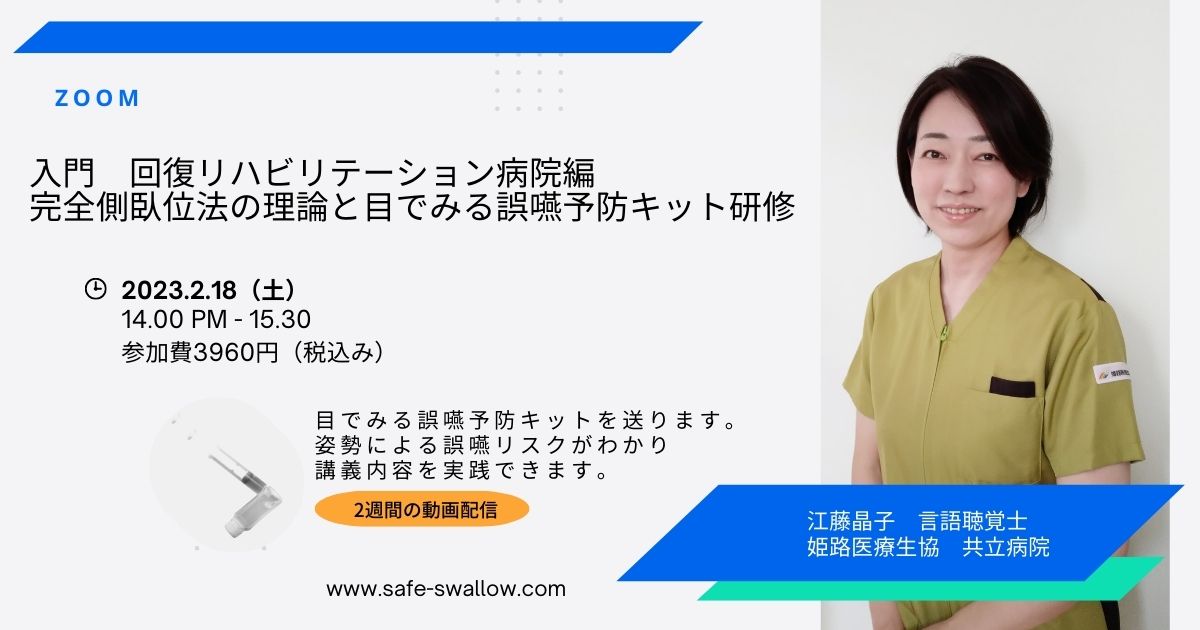 講師:江藤晶子 言語聴覚士 姫路医療生協 共立病院 【50分の講義】 ・完全側臥位法の原理と理論 ・代表的な嚥下代償姿勢の比較 ・完全側臥位を実施すべき代表的な障害(症状) (嚥下反射惹起遅延、咽頭収縮不全、喉頭機能障害) ・講師の経験を話してただきます。 【10分の目でみる誤嚥予防キット研修】 手に取って一緒に学ぼう! 誤嚥リスク、経口摂取の可能性、誤嚥性肺炎予防、楽な吸引 ※目でみる誤嚥予防キット研修はクリックポストで発送いたします。 兵庫県からの発送で、通常3日ほどで届きますが遠方(北海道・沖縄・離島)はさらに日数を要します。 セミナー当日に使用するには早めの申し込みをお願いいたします。 セミナー終了後、完全側臥位導入支援の説明会をいたします。参加は自由です。 完全側臥位法をあなたの施設に導入することを目的にあなたをサポートします。 サポート内容 ・1人で悩まないで、ほとんどの悩みは、すでに解決しています。 ・色々な角度から学ぶセミナー企画がお得に受講できる。 ・会員限定セミナーでより身近な悩みを解決。 ・過去の厳選Zoomセミナーを無料で学べる。 ・講師が直接症例相談します。 ・あなたの施設に必要な研修をサポートします。 ・本気で完全側臥位法を取り入れたい方へ、VEの診断力を全力でサポ ートします。 ・完全側臥位を安全に保ち食べるために開発したサポート商品が安 く買える。