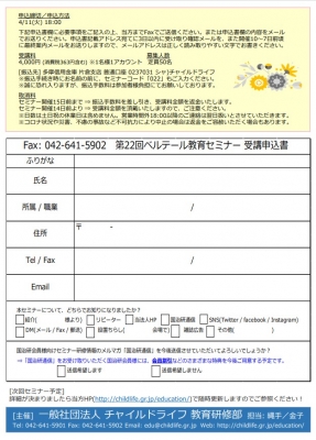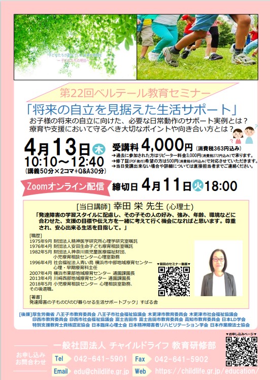 [セミナー内容] 第22回ベルテール教育セミナー「将来の自立を見据えた生活サポート」が4/13(木)10:10-12:40に、Zoomオンラインによる開催で決定いたしました! 2023年度最初のセミナーということで、一昨年のセミナーで発達障害の子どもを支える生活サポートについて基本理解から活用事例まで丁寧に解説していただきました心理士の幸田栄先生より、今回は「子どもの将来自立に向け、身につけるべき日常動作のサポート方法、日々の療育や支援、指導において必要とされる向き合い方や取り組み方、遵守すべき注意事項や大切なポイントなど」について、今までの豊富な実績や経験を基に、分かりやすくレクチャーしていただきます。 幸田先生の前回講演ダイジェスト動画②⇒ https://youtu.be/-OxecQ-8fZY 幸田栄先生よりお誘いのお言葉「発達障害の学習スタイルに配慮し、その子その人の好み、強み、年齢、環境などに合わせた、支援の目標や伝え方を一緒に考えて行く機会になればと思います。尊重され、安心出来る生活を目指して。」 放課後等デイサービス職員や特別支援学校教員、カウンセラー、臨床心理士、公認心理師、医師、看護師、PT、OT、ST、研究者など児童発達支援関係者様、家族の方々にとって学び深く、実り多き貴重な機会となり、今後の業務や活動、ケアにお役立ていただけますと幸いです。詳細をご参照の上、ぜひ前向きに参加をご検討ください。多くの関係者皆様のご参加を心よりお待ちしています。 ※4/13(木)当日参加出来ない方は、ぜひ担当者までご相談くださいませ。 [申込締切] 4/11(火) 18:00 [問合先/申込先] お気軽にご連絡ください! 一般社団法人チャイルドライフ 教育研修部 担当: 縄手/金子 Tel: 042-641-5901 Fax: 042-641-5902 Email: edu@childlife.gr.jp Web: https://childlife.gr.jp/education/tag/seminar/
