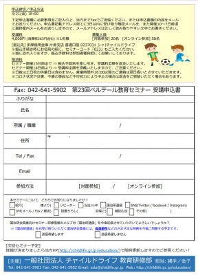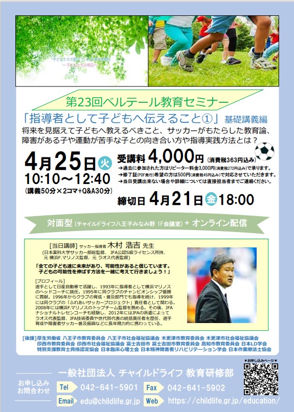 [セミナー内容] 第23回ベルテール教育セミナー「指導者として子どもへ伝えること①」基礎講義編が4/25(火)10:10-12:40に、対面型+Zoomオンライン配信によるハイブリッド開催で決定いたしました! プロサッカー選手として活躍後、Jリーグ横浜F.マリノスのトップチーム監督やラオス代表チーム監督など、指導者としても輝かしい実績や豊富な人脈をお持ちの木村浩吉先生より、「サッカーから得られた教訓や教育論、子どもの将来を見て教えておくべきこと、障害がある子や運動が苦手な子との接し方や指導方法」など、サッカー指導者という貴重な経験と視点から、熱意を持って語っていただきます! 木村浩吉先生よりお誘いのお言葉「全ての子ども達に未来があり、可能性があると信じています。子どもの可能性を伸ばす方法を一緒に考えて行きましょう!」 子どもに関わっている職種の方、指導者、教育者、支援者、保護者の方、児童発達支援関係者皆様の今後の業務や活動、ケアにぜひお役立てください!詳細をご参照の上、参加ご検討の程よろしくお願いいたします。 ※4/25(火)当日参加出来ない方は、ぜひ担当者までご相談くださいませ。 [申込締切] 4/21(金) 18:00 [問合先/申込先] お気軽にご連絡ください! 一般社団法人チャイルドライフ 教育研修部 (担当: 縄手/金子) Tel: 042-641-5901 Fax: 042-641-5902 Email: edu@childlife.gr.jp Web: https://childlife.gr.jp/education/tag/seminar/