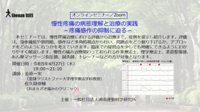 慢性疼痛症例におけるリハビリテーションを進める上で多面的評価に基づいたアプローチが重要であることが報告されています。多面的評価とは、症例の身体機能のみでなく精神機能や社会的背景など、痛みに関連する要因について多角的視点から探ることです。また、近年では定量的感覚検査による「感作(痛みの感じやすさ)」の評価の重要性が数多く報告されています。慢性疼痛症例の訴えは多様性があり、対応は個々に必要であると思います。症例の訴えと、評価の整合性はとれているか、アプローチは正しいのか、疑問に思うことも多いと思います。 本セミナーでは、慢性疼痛治療における評価から治療まで、症例を提示し紹介します。評価は、身体機能や質問紙、感作など多角的視点から行い、問題点をどう掘り下げるか、アプローチをどのように行うかを考えていきます。臨床での疑問点を少しでも明確にできるようにわかりやすく解説します。このセミナーでは、患者さんが日頃感じている痛みが慢性疼痛患者特有の思考を発生させるため、痛みを感じさせない治療を紹介します。
