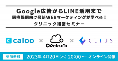 クリニック開業医・開業検討医の先生方を対象に、クリニック経営セミナーを開催します。 病院口コミ検索サイト『Caloo』やWEB予約・問診サービス『アポクル予約・問診』等のサービスを展開するカルー株式会社、LINE診察券やLINE公式アカウントの作成&運用代行を行う株式会社ユーザリンクスより、クリニックマーケティングに詳しい講師をお招きしクリニック経営セミナーを開催します。 本セミナーでは、Google広告の運用やクリニックHPのSEO対策、LINEの運用から活用事例まで、いますぐに実践したいポイントに絞ってご紹介します。 医療機関に特化したデジタル・マーケティングを実践することで、集患・増患を実現し、安定した経営につながります。院長先生はもちろん、事務長様も一緒にぜひご聴講ください。 【 講演概要 】 ・日 時 :2023年4月20日(木)20:00~21:15 (予定) ・会 場 :オンライン開催 ※申込時に専用URL送付 ・費 用 :参加費 無料 ・申込締切 :2023年4月20日(木)18:00