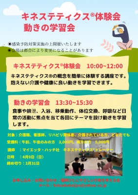 午前中にキネステ ティクス®︎の体験会を午後に日常の生活の活動(食事、排泄、入浴、起居動作、移動、呼吸等)の一つに焦点を当てた動きの学習を行います。