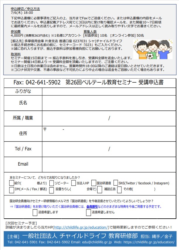木村浩吉先生よりお誘いのお言葉 「全ての子ども達に未来があり、可能性があると信じています。子どもの可能性を伸ばす方法を一緒に考えて行きましょう!」