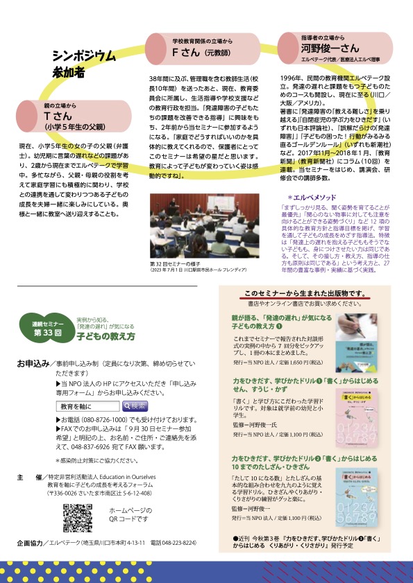 1996年、民間の教育機関エルベテーク設立。発達の遅れと課題をもつ子どものためのコースも開設し、現在に至る(川口/大阪/アメリカ)。2019年7月、大阪教室をオープン。
