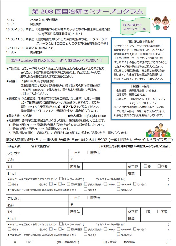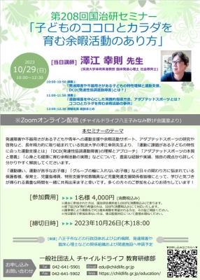 昨年度ベルテール教育セミナーで講師を務めていただいた筑波大学体育系の澤江幸則先生より、本年度は第208回国治研セミナー「子どものココロとカラダを育む余暇活動のあり方」というテーマにて10/29(日)10:00-12:30にZoomオンラインで開催させていただくことになりました! 「運動に課題がある子どもの特性に合わせた運動支援」「DCD(発達性協調運動障害)の理解とアプローチ」「アダプテッドスポーツの本質と意義」「心身とも健やかに育む余暇活動の実例」などについて、発達障害や不器用さがある子どもや青年への運動支援や余暇活動サポート、アダプテッドスポーツの研究や啓発に長年精力的に取り組まれている澤江先生より詳しく丁寧に解説していただきます! 運動嫌いまたは運動が苦手なお子様、グループの輪に入れないお子様への向き合い方に日々悩まれている児童発達支援者様や医療関係者様、ご家族の皆様にとって、多くの学びと気づきが得られる貴重な機会になりますと幸いです。ぜひ多くのご参加を心よりお待ちしています(^^)/ ※諸事情で開催当日に参加出来ない方は、ぜひお気軽にご相談ください。