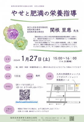この度、福岡県摂食障害支援センター事業の一環といたしまして、県民公開講座を開催いたします。 糖尿病や肥満症のみならず、摂食障害患者さんへの栄養指導も精力的に行われている東京大学医学部附属病院病態栄養治療部 副病態栄養治療部長の関根里恵先生にご講演いただきます。 ご多用のこととは存じますが、皆様のご参加を心よりお待ち申し上げます。