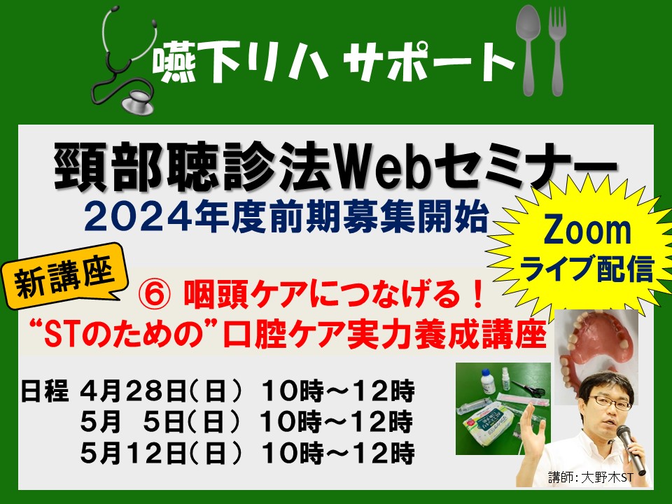 電子カルテで情報収集していると、次のような看護師や医師の記録をよく目にします。 ① 「食事開始後すぐにむせ込みあり3口で終了。誤嚥リスクが高く食事量のアップは慎重に行う必要がある」 ② 「食事再開後に発熱。誤嚥性肺炎(疑)のため、本日から禁食対応に」 ③ 「肺炎の状態が落ち着いてからSTに嚥下評価依頼予定」 きっとどこの病院や施設でもよくあることでしょう。しかし、嚥下リハビリに熱心に取り組まれているSTの皆さんは、「すべて食事のせい」にしてしまう風潮に疑問を抱いていると思います。 ① の患者さんは、大腿骨頸部骨折術後にコロナ隔離も加わり廃用が進み、誤嚥性肺炎を発症してからST依頼があった方です。ペーストレベルは嚥下可能なのですが、咽頭分泌物貯留が多く、食事に関係なく湿性咳嗽がみられています。湿性咳嗽に惑わされて食事を制限しすぎるデメリットはどうでしょうか? ② の場合、しっかり評価を行い、安全に嚥下可能なものから食事を再開後に発熱があったわけですが、その熱の原因は「食事による誤嚥」でしょうか? 数日の絶食期間中の口腔ケアが不十分であれば、不顕性誤嚥の影響も大いに考慮すべきです。 ③は②と同じで、まずは肺炎が落ち着く前からしっかり口腔ケアを行っていく必要がありますし、咽頭ケアのためにもトロミ水程度は評価して摂取を進めたいところです。嚥下評価ができるSTならではの効果的な口腔・咽頭ケアがあるはずです。 誤嚥性肺炎の多くは夜間の唾液誤嚥が原因であるという複数の報告があるものの、残念ながら現場では誤嚥性肺炎の犯人が「食事の誤嚥」にされてしまい、禁食によって低栄養・廃用が進むという悪循環がみられています。 このセミナーでは、STが摂食嚥下リハビリをスムーズに進めるために欠かせない口腔ケアの知識とスキルをお伝えしていきます。私が実践している院内での口腔ケアの取り組みについて、用品や使用方法、症例を紹介するとともに、超便利な咀嚼・食塊形成~送り込み評価のポイントもお伝えします。 嚥下リハビリは口腔ケアに始まり、口腔ケアに終わるといっても過言ではありません。嚥下評価ができるSTならではの咽頭ケアの意識をもった口腔ケアについて学びましょう! ※「頸部聴診法」の詳しい内容については既存のセミナー①②をご受講ください。 ※新講座の受講の順番は既存の①②③④の前後どちらでも大丈夫です。