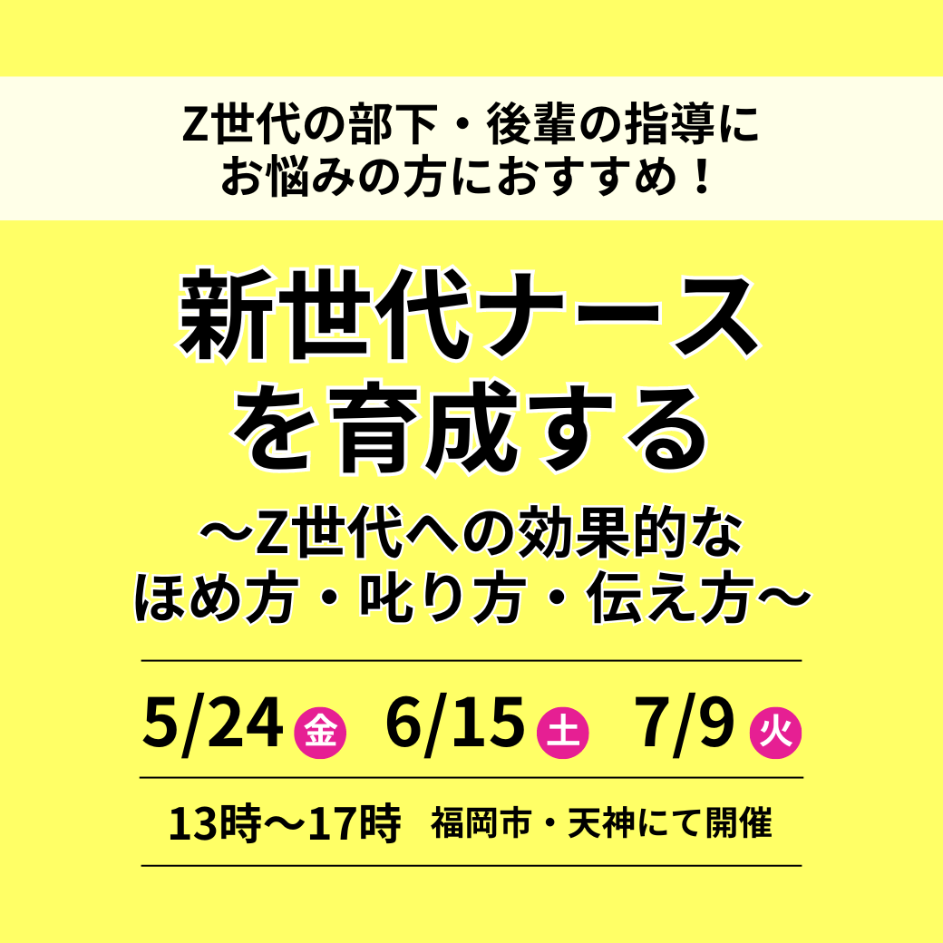 Z世代の指導で次のような課題を抱えてませんか? ✔ Z世代の言動が理解できず、どう接していいか分からない ✔ Z世代ナースとの関係構築がうまくいっていない ✔ Z世代ナースに指導しても響いておらず、空回りしている気がする ✔ 指導にはコーチングがいいと聞いたけど、勉強したことがない ✔ 新人が働きやすい職場環境をどうやったら作れるのか分からない ✔ 指導者としての経験が少なく、指導に自信がない ✔ 従来の指導方法がZ世代ナースには通用しないと感じている Z世代の新人(後輩)への指導は、彼らの特性に合わせたアプローチで行うことが重要です。 当セミナーでは、 ① Z世代が育ったバックグランドから彼らZ世代の価値観や特性を理解します ② Z世代の特性に合わせた指導方法を学び、コーチングスキルの習得&向上を目指します ③ 学んだ知識やスキルを実際の現場で即活用できるよう演習やワークを通じて体得します ▼参加者の声 (看護師Yさん・プリセプター) 新人への言葉がけや関わり方がよくわかりました。以前悩みを相談された際、何を言ってあげるべきか分からず悩みましたが、今後はしっかりと相手を肯定しつつ大切なことを伝えていけるような気がします。 (看護師Tさん・実地指導者) 自分たちと今の若い子たちは違うということは分かっていましたが、どう指導したらか分からず日々ストレスを感じていました。今日のセミナーで具体的な指導の仕方、言葉の掛け方が分かったので、すぐに現場で実践したいと思います。 (看護師Mさん・教育委員) 自分自身はいわゆる「ゆとり世代」と言われてきましたが、自分で考えることを指導されていました。今の時代の教育方法は変化しているということで、自分も考え方を変える努力が必要だと思いました。まずは、コーチングの知識を持ったうえで、実際の後輩に接してみたいと思います。 【著書のご紹介】 当セミナーの元となる本 『令和版 教えて!ホメシカ先生Z世代ナースのほめ方・しかり方・伝え方』(メディカ出版) 著:野津浩嗣(当セミナー講師) 2,860円 【参加特典】 ①セミナーの復習に使える!「指導の達人AI※」体験版プレゼント ②会場内で新刊「令和版 教えて!ホメシカ先生Z世代ナースのほめ方・しかり方・伝え方」を購入された方にはDVD(「ホメシカ理論」もしくは「コーチングとは」)をプレゼント ※「指導の達人AI」とは…野津のノウハウを学習したAI搭載型LINEチャットボットのこと。LINEで指導に関する相談を入力すると即座にAIが答えてくれるもの。 【開催概要】 日程:5月24日(金)13:00~17:00 会場:天神重松ビル(福岡市中央区天神3-4-8) 参加費:15,400円(税込)