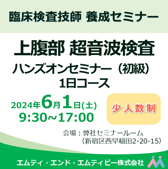 ※過去に開催した『上腹部超音波検査ハンズオンセミナー(初級)1日コース』と内容は同じですので、重複のお申込みにご注意下さい。 ※開催時間には休憩時間1時間を含みます。昼食は各自でご用意ください。 ※最少催行2名となりますので、2024年5月24日時点でお申込者数が満たない場合は、開催を延期または中止させていただくことがあります。予めご了承下さい。 ※カメラ、ビデオ、レコーダーによる録画、録音はご遠慮下さい。 ※満席の際は、キャンセル待ちのご案内となります。 ≪感染症予防対策について≫ 受講される方へ下記をお願いしております。 ・弊社フロア内・セミナー会場内でのマスク着用をお願いいたします (マスクをお持ちでない方には、受付にてマスクをご提供いたします) ・弊社フロア・セミナー会場へ入室の際、手指のアルコール消毒をお願いします ・発熱等の症状がある方は、受講を自粛していただき、キャンセルのご連絡をお願いいたします (当面、体調不良によるキャンセルについては、キャンセル料は頂戴いたしません) ・受講料を当日受付で現金支払いされる方は、お釣銭のないようご準備下さい ・弊社フロア内・セミナー会場内での大声での会話、飲食はご遠慮下さい(講師への質問、水分補給は除きます) ※弊社フロア内・セミナー会場内では、2023年3月13日以降もマスク着用及び、 定期的な窓開け等による換気、テーブル等のアルコール消毒液による定期的な清拭を行っております