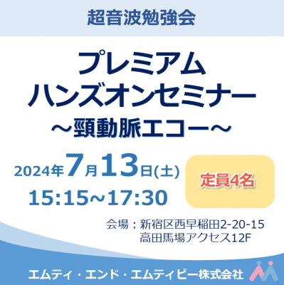 ※過去に開催した『プレミアムハンズオンセミナー ~頸動脈エコー~』と内容は同じですので、重複のお申込みにご注意下さい。 ※最少催行3名となりますので、2024年7月5日時点でお申込者数が満たない場合は、開催を延期または中止させていただくことがあります。予めご了承下さい。 ※カメラ、ビデオ、レコーダーによる録画、録音はご遠慮下さい。 ※満席の際は、キャンセル待ちのご案内となります。 ≪感染症予防対策について≫ 受講される方へ下記をお願いしております。 ・弊社フロア内・セミナー会場内でのマスク着用をお願いいたします (マスクをお持ちでない方には、受付にてマスクをご提供いたします) ・弊社フロア・セミナー会場へ入室の際、手指のアルコール消毒をお願いします ・発熱等の症状がある方は、受講を自粛していただき、キャンセルのご連絡をお願いいたします (当面、体調不良によるキャンセルについては、キャンセル料は頂戴いたしません) ・受講料を当日受付で現金支払いされる方は、お釣銭のないようご準備下さい ・弊社フロア内・セミナー会場内での大声での会話、飲食はご遠慮下さい(講師への質問、水分補給は除きます) ※弊社フロア内・セミナー会場内では、2023年3月13日以降もマスク着用及び、 定期的な窓開け等による換気、テーブル等のアルコール消毒液による定期的な清拭を行っております