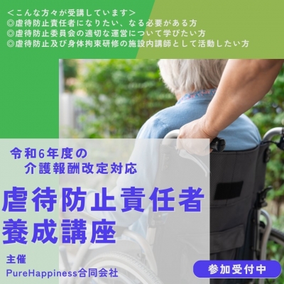 令和6年度の介護報酬改定に伴い、「虐待防止措置」が義務化されました。 この講習会では、虐待防止委員会や虐待防止研修会の適切な運営をできる虐待防止責任者を養成します。 オンライン開催(zoom使用)となります。全国どこからでも受講可能です。 <こんな方々が受講しています> ◎虐待防止責任者になりたい、なる必要がある方 ◎虐待防止委員会の適切な運営について学びたい方 ◎虐待防止及び身体拘束研修の施設内講師として活動したい方