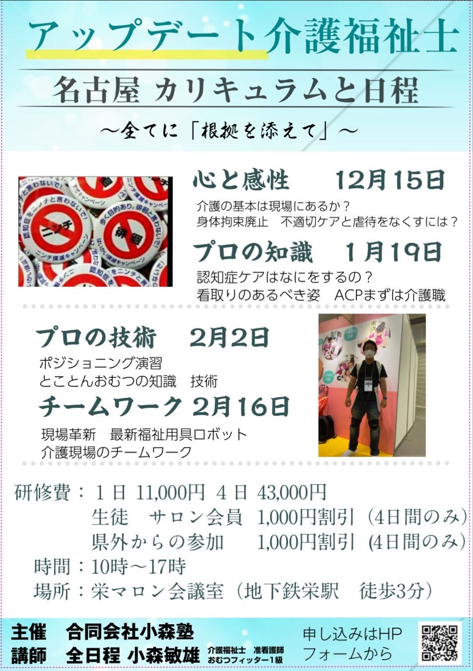 【講座への思い】 分野の進化と介護現場の不調和 要するに、介護分野の進歩は目覚ましいが 介護現場がアップデートされていないと感じることが頻繁にあります。 ○本来質の確保と担保を果たすべき主任リーダーが適切な教育を受けていない ○誤った介護アプローチ(技術だけでなく、考え方も含む)を続けるベテラン介護職が 然るべき教育と指導を受けていない 上記事象が横行すれば、介護福祉士の取得に実務者研修が必須となったにもかかわらず 「学んだことを実践で活かすことができない」という事態になります。 上司や先輩が誤った介護を実施しているため従わざるを得ない現実があり 学んだことを現場で活かせない、潰されてしまっている。 私はフリーランスで各地で講義を行う中 嫌という程に見聞きしてきました。 このままでは問題が解決しない。 然るべき立場の人が学ばなければ ベテラン介護職が変わらなければ 私の講義を受けた現場の介護職が報われず 転職を余儀なくされる人も増えると感じました。 そんな思いから ベテラン介護福祉士や主任の方々の 「アップデート」を目指す 研修を企画しました。 第1回は2023年9月にスタートし 全国各地から10名の参加者が集まりました。 私が唱える「アップデート」とは 最新情報を取得することに留まりません。 バグの修正 不具合の修正 思考の効率化 も含んだ最新状態にすること。初心に変えることも必要。 カリキュラムにおいて 最新情報よりも基本に戻り バグと不具合の修正 および答え合わせが多いこともあります (自然な流れでそうなりました)。 私が 「今」の受講生に対して伝えている 知識、技術、精神面、情報を 現場の役職者やベテランに向けて魂込めて伝えます。