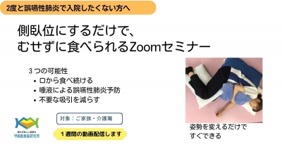 側臥位にするだけで、むせずに食べられるZoomセミナー ~誤嚥性肺炎で入院させたくない方へ~ 「重度嚥下障害者が、口から食べること」と 「誤嚥性肺炎で入院させないこと」は 実は意外に簡単にできる場合がある。 しかし、 【現状は情報が届いていないので】 ・食べられる可能性があるのに、食べることを禁止される。 ・唾液誤嚥を防ぐことができるのに、誤嚥性肺炎で入院する。 ・のどのゴロゴロをなくすと吸引しなくてもいい 【側臥位の有効性を知らない人が多すぎる】 ・誤嚥性肺炎は側臥位にするだけで、予防できる。 ・むせて食べられない方は、側臥位になるだけで食べられる方が多い。 ・唾液を口から出すだけで、誤嚥性肺炎での入院を減らせる。 【本セミナーの目的は、今すぐできることを伝えます】 ・誤嚥性肺炎で入院させない ・むせずに口から食べる ・夜間の吸引をなくす 完全側臥位法の理論と実践方法を学ぶことで、解決できる可能性があります。