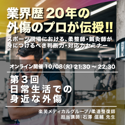 【セミナー概要】 昨今、柔道整復師が外傷を診る機会が減少している柔整業界。 養成学校で学んだ知識のみで、臨床で施術した経験がある先生はどれくらい存在するでしょうか? 骨折・脱臼・捻挫などの完全外傷と出会った時、あなたならどうしますか? 困っている患者様、スポーツ選手を救えるのはあなたかもしれません。 応急処置・医療との連携・患者様、スポーツ選手へのその後の後療に対する適切な指導、管理。 もしもの時に備えて少しでも外傷に対する技術・知識を身につけましょう。 【プログラム内容】 こちらのセミナーは全4回の構成となっております。 ・第1回「業界20年でみた外傷」 ・第2回「スポーツの現場で求められる対応力」 ・第3回「日常生活での身近な外傷」 ・第4回「実際の応用・応急手当」 全体を通して、様々な観点から“外傷”をキーワードに講義させていただく予定なので、ぜひ皆様のご参加お待ちしております。 【最後に】 地域に必要とされ、信頼されるスペシャリストを一緒に目指しましょう!