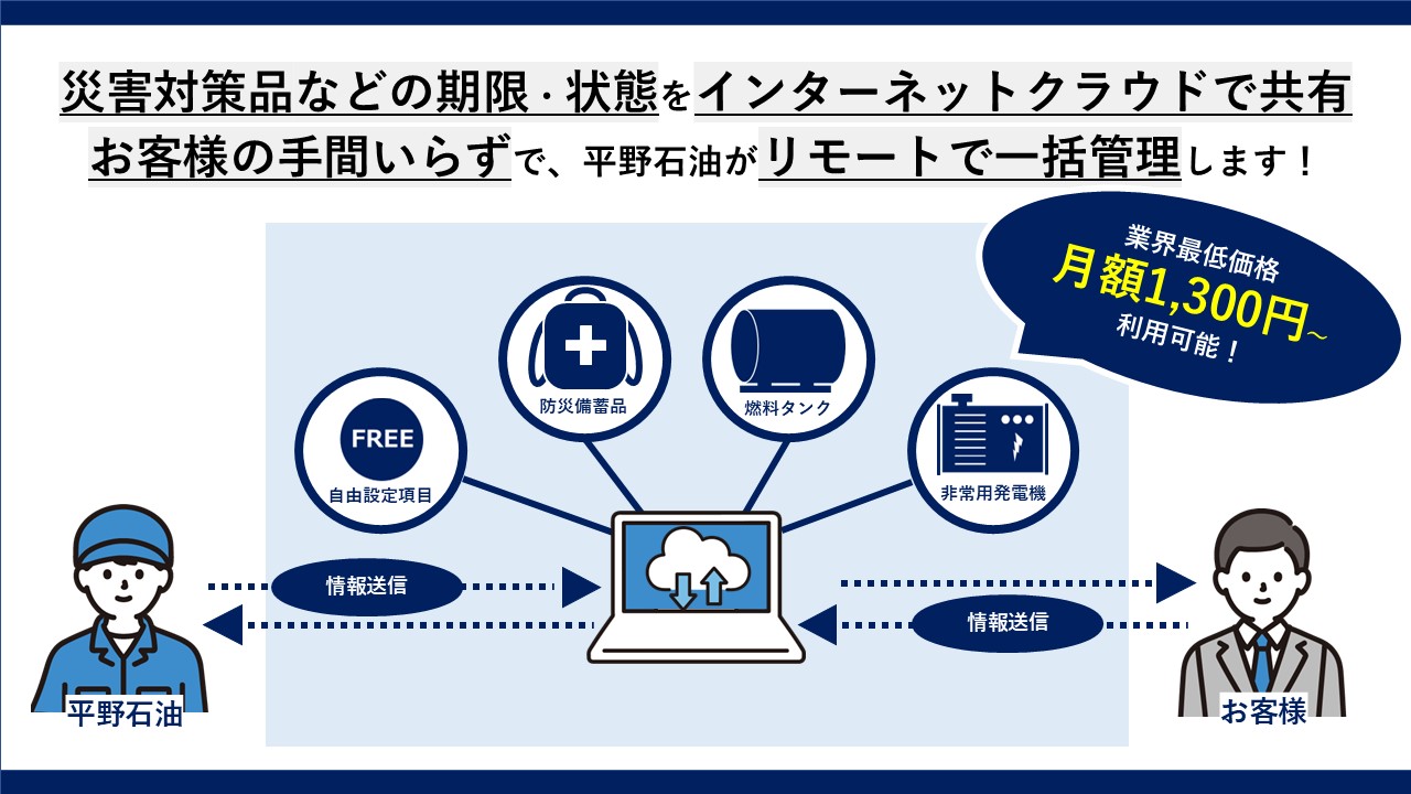 「防災対策品の管理費用、もっと簡単にできないかな…」 そんなお悩みを持つ施設管理者の皆様にWEBセミナーのご案内です! 弊社では、災害に備えた備蓄品や設備の期限・状態を 一覧で管理するインターネットクラウドサービスを開発しております。 他社がリリースしている備蓄品管理サービスと比べて ※低価格で ※簡単に ※しかも備蓄品だけではなく、防災用設備を含めて総合的に管理することが可能です(発電機やその燃料など) サービスの正式なリリースはもう少し先となりますが、是非類似サービスをご検討のお客様、あるいはこれから検討を始められるお客様に是非ご紹介したく、WEBセミナーを開催いたします! 具体的なWEBセミナーの内容は下記の通りです。 ◆防災対策品 管理サービスの概要 ・どのようなサービスなのか? ・競合サービスとの違いは何か? ・そもそも発電機や、発電機用の燃料は劣化するのか ・防災対策品のほかに、管理、期限管理できること (医療機器の管理や医薬品の期限管理など、ご要望次第でカスタマイズ可能) ご参加の程、おまちしております!