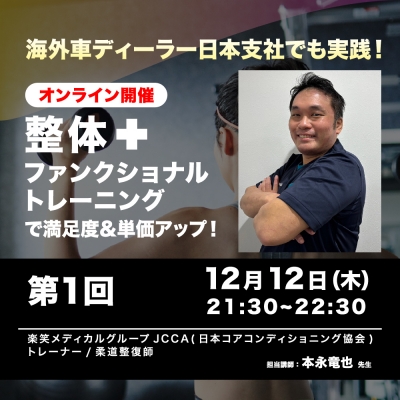 ファンクショナルトレーニングを今の整体メニューとどのように繋げて、どのように患者様に提供するのかをイメージすることができる 【到達目標に達すると、主にどのような知識・技術が身に付くか?】 ・自院の整体メニューの満足度と効果アップ、そしてそれに伴い単価もアップ ・今まで逃していたニーズに対するサービス供給力のUP 【なぜ上記目標到達、知識、技術取得が必要か】 他院との差別化、患者様のニーズ開拓及び、今まで逃していたニーズに応えるメニューを提供することで単価と満足度が上がります。 整体メニューに対してのプラスαとして導入することで、「この院で整体を受けることで将来どのような状態になるのか」を患者様に想像してもらうことができ、通院意欲をもってもらいやすくなります。