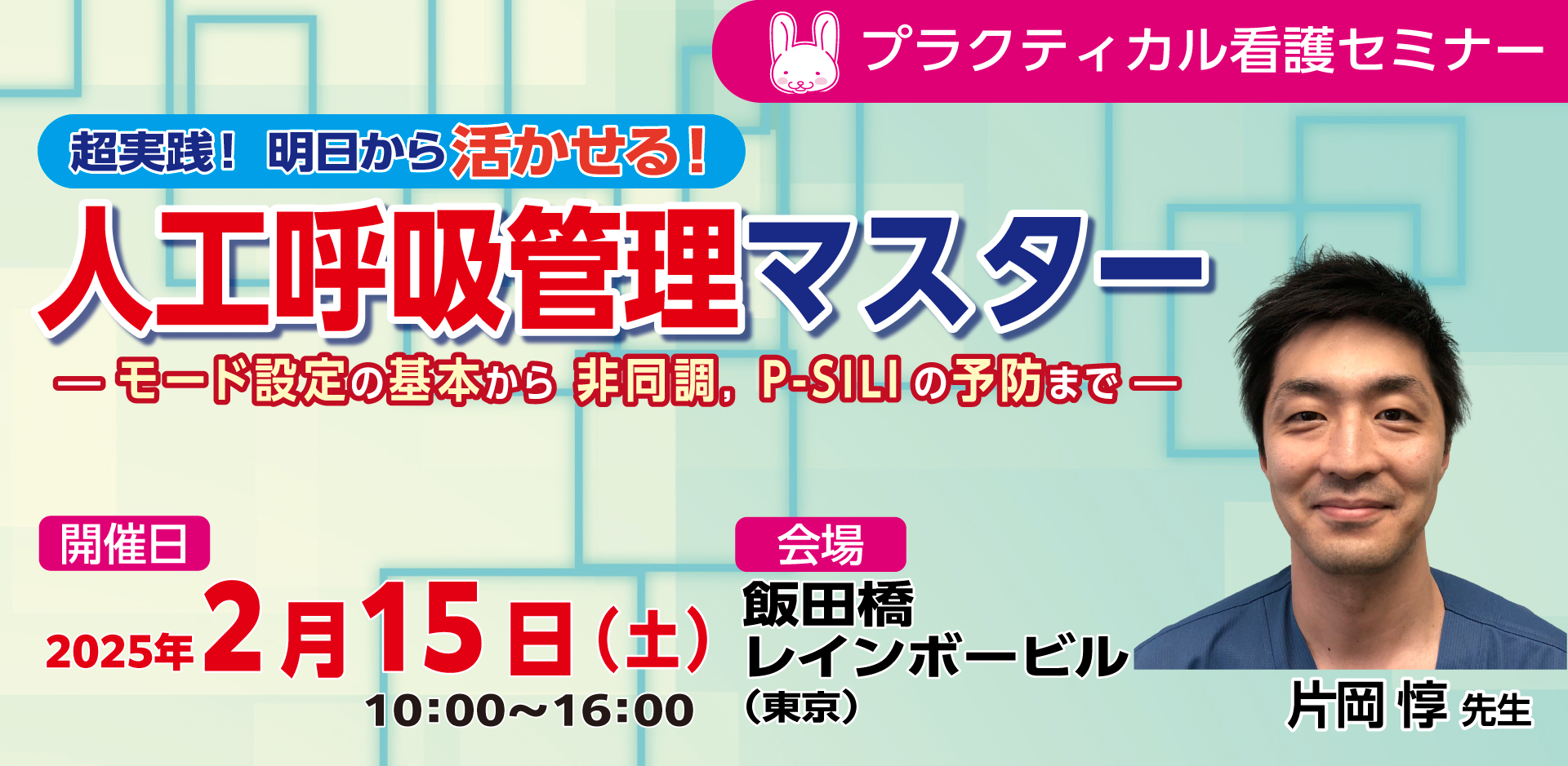 今回のセミナーでは人工呼吸管理をマスターする!ということで,適応から,呼吸器装着時のモード選択と設定方法,自発呼吸が出てきた時の非同調と,自発呼吸による肺傷害を起こさないためのモニタリング,そして呼吸器離脱と,人工呼吸管理の全ての段階において看護師が知っておくべきポイントを網羅しました.特殊なデバイスや難しい病態での呼吸管理の話ではなく,基本的だけれど特にベッドサイドで管理する看護師が「患者さんにとって安全で優しい人工呼吸管理」を実践するために知っておいて欲しい内容です.当日は日々の臨床で悩むことなど質問いただければ,時間の限りお答えさせていただきます.