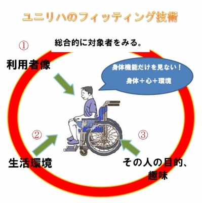フィッティング(適合)の定義は、その車椅子を利用する人を中心として、用具を身体的、環境的、目的的、社会的に適合化するプロセス。 要するに・・・シーティング+車椅子採寸技術+車椅子住環境整備(メンテナンス)です。 シーティングという姿勢調整だけでなく、車椅子の寸法調整も加えた生活姿勢保持といった意味合いがあります。 生活環境を考えるフィッティング(適合)は、車椅子の設計からスタートします。まずその人に合う椅子を設計し、その人が実際に腰に触れるシートサポートすなわちシーティングを構築していく順番です。 『車椅子設計採寸技術→車椅子シーティング→車椅子住環境整備→社会参加や自己実現へ』