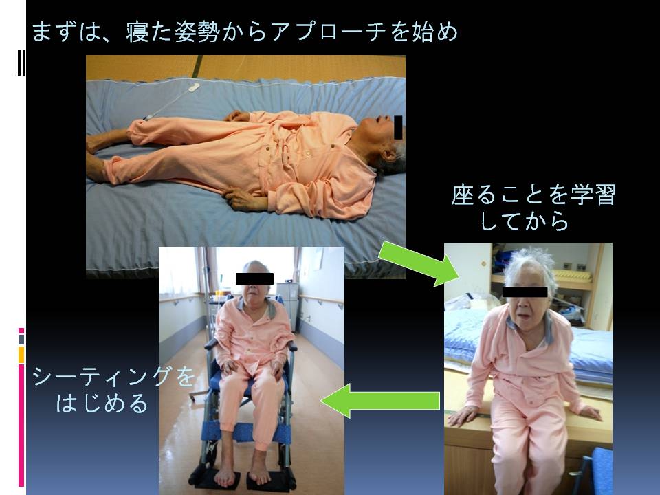 慢性期、起居動作、ADL全介助から座位自立と自発言動が表れた症例 ※※※このページにある画像を見てください。 症例の状態と、どのような変化が起こったかをご確認ください※※※ 慢性期で全介助の生活を6年間続けてきた女性で、全身の筋緊張が高く、拘縮していると判断されていた症例です。 関節拘縮や円背、側湾、失調症状、バランス不良、筋力低下、廃用症候群、褥瘡がある方や二次障害を重複している方です。周囲からのケアやアプローチは難渋し、シーティング技術だけでは座れない人はたくさんいらっしゃることでしょう。 その場合、リクライニング車椅子やチルトリクライニング車椅子が必須になりますが、とても高価なシーティングクッションや車椅子を購入する事になりますし、場合によっては座位保持装置の申請も必要になるでしょう。(現在は介護保険のレンタルもありますが、販売価格が高価であるため、貸与点数も高値になります。そうなると他に必要なサービスにも影響していきます。) ■しかし、臥位から筋緊張制御を行い姿勢全体を変えてしまえば、普通型車椅子でも十分座れるようになります。 ■これがポジショニングからシーティングを行う原理です。 無重力疑似空間がリラックス環境をつくり副交感神経が有意になります。 ■身体が反作用や圧を感じられない状態になる事で、身体はリラックス方向にベクトルを向け、副交感神経が優位となります。 ■副交感神経が優位になれば、交感神経支配から解放される事になります。この環境が作り出す事は、筋の緩み、筋緊張の緩和、心拍数・呼吸数の安定、摂食や排泄、睡眠等の改善です。 身体全体にかかる圧が数mmHgとなる。身体にかかる圧が骨を作り、循環が発生し、呼吸を行ないます。脚は大地を踏み、その安定から体幹の運動や手の作業を行います。重力があるからこそ、我々は生活が出来ているはずです。しかし、障害を呈した方はこの状況が大きな負担となります。 生誕より獲得してきた地球上での重力の使い方が全く通用しなくなるからです。 これでは、真っ直ぐに座る、立ち上がる、歩く等の運動はとても難しく、生活をしていくためには、その身体状況で再び重力環境下での身体の動かし方を学び直さなくてはなりません。 それを座位からではなく、臥位から行なうのがポジショニング To シーティングであり、その理論が数mmHgでポジショニングを行なう微小反作用環境のアプローチです。 この最新の知見を共有しましょう。