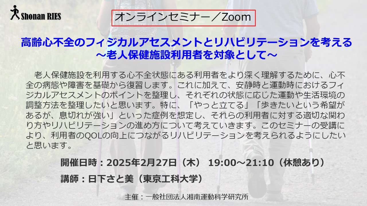 老人保健施設を利用する心不全状態にある利用者をより深く理解するために、心不全の病態や障害を基礎から復習します。これに加えて、安静時と運動時におけるフィジカルアセスメントのポイントを整理し、それぞれの状態に応じた運動や生活環境の調整方法を整理したいと思います。特に、「やっと立てる」「歩きたいという希望があるが、息切れが強い」といった症例を想定し、それらの利用者に対する適切な関わり方やリハビリテーションの進め方について考えていきます。このセミナーの受講により、利用者のQOLの向上につながるリハビリテーションを考えられるようにしたいと思います。