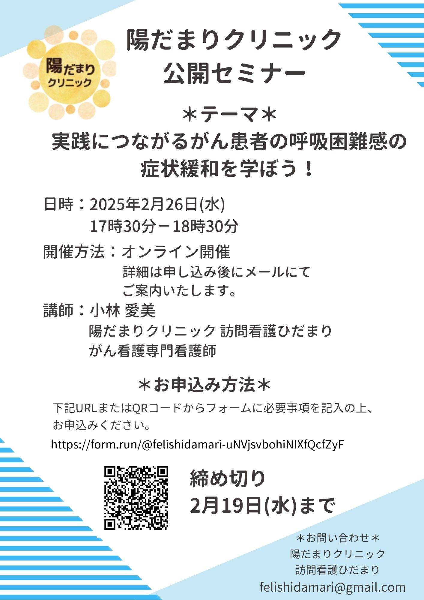 この度、当院主催の公開セミナーを下記のとおり開催することとなりましたので、ご案内申し上げます。 今回のテーマは「実践につながるがん患者の呼吸困難感の症状緩和を学ぼう!」としました。 オンラインで行いますので、ネット環境があればどこからでもご参加可能です。 ぜひともご参加くださいますようお願い申し上げます。 日時:2025年年2月26日(水) 午後5時30分から午後6時30分 場所:オンライン開催(ZOOM) テーマ: 実践につながるがん患者の呼吸困難感の症状緩和を学ぼう! 講師:小林 愛美(陽だまりクリニック 訪問看護ひだまり がん看護専門看護師)