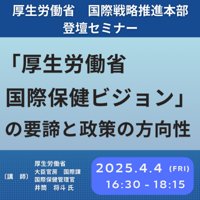 今世紀に入り、国際保健の課題は、感染症対応や、医薬品の開発、医療人材の育成・確保、気候変動と健康など幅広い領域にわたり国際的な連携が不可欠となっている。国際社会の動きと国内政策が連動するようになっていることを背景に、厚生労働省として国際保健により積極的に関与していく観点から、令和6年8月、国際保健分野の基本方針、重点的に取り組むテーマとその具体的取り組みが盛り込まれた「厚生労働省国際保健ビジョン」を策定した。本講演では、同ビジョンの概要と政策の方向性について詳説する。