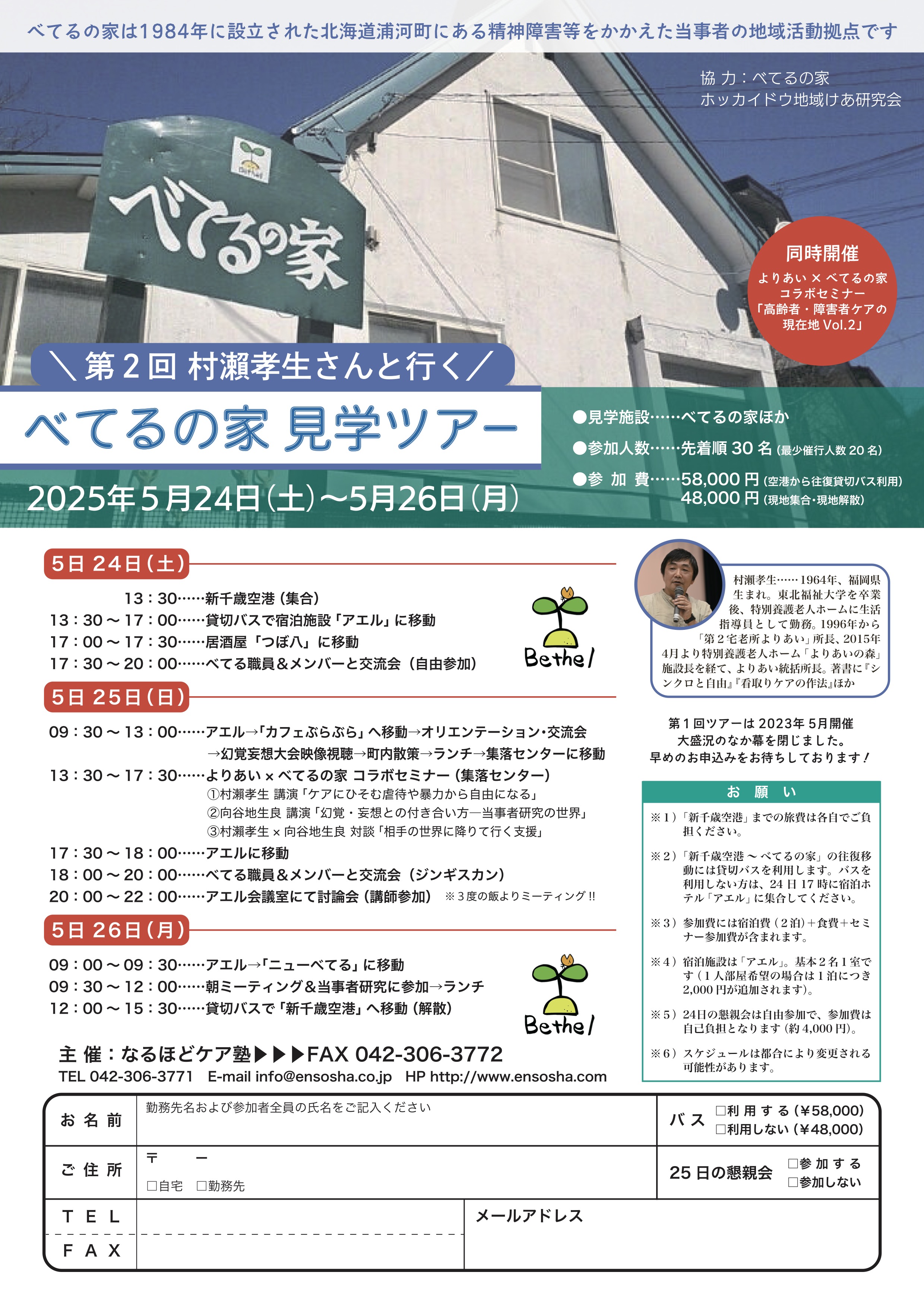 第2回 村瀬孝生さんと行くべてるの家見学ツアー●同時開催! ぼけや障害をかかえた相手の世界に沿うことで、思いがけない「シンクロ」が起こり、<ケアし合う>共感的世界が生まれます。 お互いをリスペクトしてきた2人がケア観や人間観をぶつけ合います! ⦿向谷地生良さんプロフィール 北海道医療大学名誉教授、浦河べてるの家理事長 1955(昭和30)年、青森県生まれ。大学卒業後、浦河赤十字病院の精神科専属のソーシャルワーカーとして赴任し、84年に浦河べてるの家を設立。2003年より、メンバーと共に「当事者研究」の普及を目指し、全国各地を飛び回る。著書に『「べてるの家」から吹く風』(いのちのことば社)他