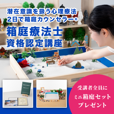 数年はかかる「箱庭療法の技術」を2日間で! 通常は数年かかると言われる箱庭療法の学びを、全2日間の講座で「箱庭カウンセラー(R)」「箱庭療法士」の資格を取得し、幅広いクライアントに対応できる力を手に入れましょう。 【箱庭の魅力】 言葉に頼らずにクライアントの深層心理にアプローチできる点です。 「箱庭療法士資格認定講座」では、砂やフィギュアを使って内面を視覚的に表現する最新技術を学びます。 この技法は、クライアントに新たな気づきを与え、カウンセラーとしてのスキルを大幅に向上させる強力なツールです。 【詳しくはこちら】 https://x.gd/rK7v0 【最新の動的箱庭療法が学べる】 独自開発した動的箱庭療法は、「過去、現在、未来」の時制を取り入れ、心象風景を動かすことでネガティブなイメージをポジティブに変える新技法です。 従来の静的な箱庭療法に比べてクライアントの負担が少なく、短期間で効果が期待でき、即実践できるスキルとしてカウンセラーの成長を支援します。