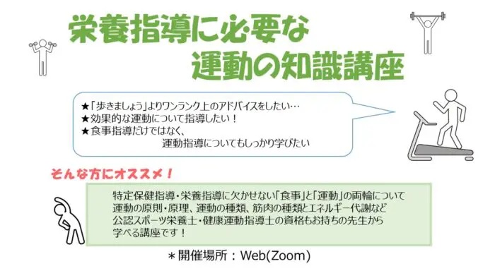 大好評の『栄養指導講座』シリーズ! この講座は、栄養指導のなかでも「運動指導」について特化し、 運動の原則原理や筋肉とエネルギー代謝などを学び、食事・運動と生活習慣病との関連への理解を深める講座です。 栄養指導に携わっている方はもちろん、これから栄養指導業務を始める方、経験が浅く自信がない方、ブランクがある方、運動の指導について改めて勉強したい方にも必見です。 ・「歩いてください」よりワンランク上のアドバイスをしたい ・効果的な運動について指導をしたい ・食事指導だけではなく、運動指導についてもしっかり学びたい そんな方にオススメの講座です。 運動の種類や筋肉について学び、業務に活かしてみませんか?