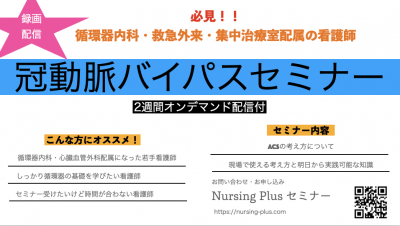 この秋の時期に、ACSついて詳しくわかりやすい言葉でセミナーを受講できます。 ACSや狭心症の対象となるに冠動脈バイパス術対する病態から手術の流れや観察ポイントの方法を理解することができます。 OPCABやCABGの知識をぎゅっと詰めた3時間コースのセミナーがこのお値段で受講可能です。 オンデマンド配信2週間分ありますので、おさらいにも十分使用可能ですので満足するの間違いなし。 セミナー資料もPDFで送られてくるので安心!ぜひ、この機会に呼吸器について復習や勉強をしてみませんか? 皆様の参加をお待ちしております。 主催 Nursing plus セミナー https://nursing-plus.com 営業日:9:00-17:00