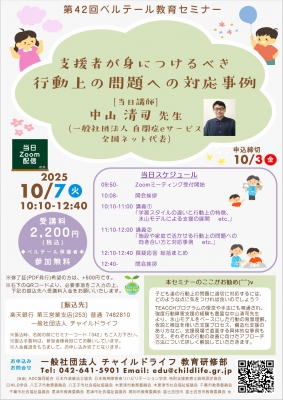 第42回ベルテール教育セミナーでは中山清司先生(自閉症eサービス全国ネット代表)を講師に招きし、「支援者が身につけるべき行動上の問題への対応事例」をテーマに講義していただきます。 中山先生は2002年にノースカロライナ大学TEACCH部で研修されており、知的障がい者、自閉症者の支援に長年携わって来られています。 また過去には第161回国治研セミナーにて「自立課題から仕事・家事活動への展開」を、第209回国治研セミナーでは「行動上の問題への対応と支援者の養成」をそれぞれテーマに講義して頂きました。 本セミナーでは氷山モデルをベースにした行動の背景理解、仮説と研修を用いた支援プロセス、構造化支援のあり方、支援現場で直面する具体的な事例やそれぞれの行動の改善に向けたアプローチ方法について詳しく解説していただきます。 児童発達支援・通所支援に携わる多職種の方のみならず、保護者の方にもおすすめのセミナーとなっております。 【講師】 中山清司先生(自閉症eサービス全国ネット代表) 【開催日時】 2025年10月7日(火) 10:10-12:40 【受講料】 2200円 ※ベルテール利用者は無料で受講していただけます 【講義方式】 Zoomによるオンラインセミナー 【プログラム】 10:10‐11:00 「学習スタイルの違いと行動上の特徴、氷山モデルによる支援の展開 etc..」 11:10‐12:00 「施設や家庭で活かせる行動上の問題への向き合い方と対応事例 etc..」 12:10‐12:40 質疑応答 <第209回国治研セミナー参加者の声> ・中山先生の症例動画を拝見して、構造化することで行動が変わることを改めて学びました。 ・患者様が過ごしやすい生活を送れるよう、臨床の中にTEACCHの考え方を取り入れていきたいです。 ・TEACCHの中ではあまり聞くことの少ないテーマでのお話があったので興味深かった。 ・講義の内容もさることながら、目の前の対象者と向き合う支援者としての姿勢や学びの姿勢そのものが、3人の先生方から感じられ、その姿勢に触れたことが一番の収穫でした。 ・諏訪先生のお話は 以前他の講義でお聞きした内容を、更に深めた物だったので深い学びになりました。 ・氷山モデルの右側の部分が知れて良かった。日頃から行動の背景を考えるよう努めてきたが、講師の方々も同様のお話をされており、自信がもてた。