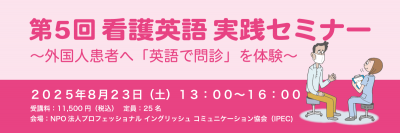 本セミナーは、外国人患者役のイングリッシュ・スピーカーとの様々な症例の問診体験を通して「外国人と話す・聴く」練習を実践的に行います。 第1部は、アメリカの医療現場で看護師として活躍していた日本人看護師の体験談の講演があります。 第2部の前半は、ウォーミングアップレッスンで、外国人患者への問診に必要な語彙・表現を学び、発音練習を行います。後半は、喉の痛み、胃痛、外傷など様々な症例の「問診聴取」の模擬体験にチャレンジします。 セミナー終了後には、「茶話会」を予定しています。異なる医療機関で働く看護師の受講生との交流ができる貴重な機会となりますので、是非ご参加ください。(参加は任意) 「自分の英語が通じた!」「患者の情報が聞き取れた!」と問診聴取をブラッシュアップして、「明日から使える看護英語」を学んで、自信を持って外国人患者の対応ができるようになりましょう。