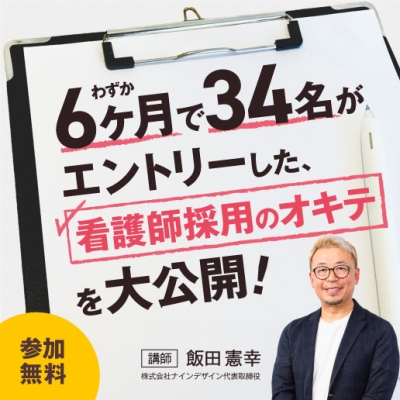 100万円越えの採用コスト… 数ヶ月で辞められてはもったいない! 辞めない看護師を採用するためのひと工夫を伝授します! セミナー概要 〜採用疲れに困った事務長へ!〜 3ヶ月離職を防ぐための "疲れず・損せず・やめない"看護師採用セミナー 【主催】株式会社ナインデザイン 【講師】飯田 憲幸(株式会社ナインデザイン 代表取締役) 【開催日】7/23(水) 【時間】14:30-16:00 【会場】オンラインZoom開催 【参加費】 無料 ------ こんなお悩みありませんか? ------ 求人を出しても何の反応もない 1人の退職をきっかけにバタバタと人が辞めた 人手が足りなさすぎて院長が雑用をしている 3ヶ月後にスタッフの退職が決まっている 当てはまる先生は、聴かないと損! 周りの医院が人材確保にいくら苦戦していても、 先生の医院だけは困らない。そんな未来を現実にします。