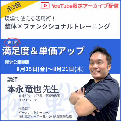 ファンクショナルトレーニングとは何かを知り、今提供している自院のメニューとどのように繋げられるのかをイメージする。そしてそれをメニュー化することで患者様の満足度が上がり、単価もあげることができます。 【到達目標に達すると、主にどのような知識・技術が身に付くか?】 ・ファンクショナルトレーニングについての知識 ・患者様への指導内容の充実 ・通院期間の延長や施術内容を段階的に変えていくことで治療効果を感じていただくシステム 【なぜ上記目標到達、知識、技術取得が必要か】 患者様に同じ施術を繰り返すことでマンネリや、こんなに通っても結局治らないなら今後も治らないという誤解を生んでしまいます。 患者様に新たなステージを提案することで、いままで通っていたことは無駄ではなく効果があったんだということを知っていただくと同時に せっかくここまでよくなったのであれば、ちゃんと最後までやりきろうという考えになるような患者様の頭の中でも筋が通った改善プランがあることで通院期間を伸ばし、離反を防ぐことができます。