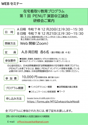 PENUT(訪問看護師向け在宅看取り教育プログラム)演習 Webセミナー 「在宅看取りを自信をもって行いたい!」との要望にお応えして、少人数での演習です。 研修までに、日本訪問看護財団のオンデマンド講義(別途費用)を受けていただき知識をみにつけたうえで、実際の訪問看護計画立案や声掛け技術など、少人数で学んでいただくセミナーです。 この演習プログラムを修了していただくことで、PENUTの修了要件となります。 財団法人日本訪問看護財団のPENUTに関するホームページは以下をご参照ください。 https://www.jvnf.or.jp/penut/