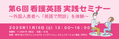 本セミナーは、外国人患者役のイングリッシュ・スピーカーとの様々な症例の問診体験を通して「外国人と話す・聴く」練習を実践的に行います。 第1部は、カナダの医療現場で看護師として活躍していた日本人看護師の体験談の講演があります。 第2部の前半は、ウォーミングアップレッスンで、外国人患者への問診に必要な語彙・表現を学び、発音練習を行います。後半は、インフルエンザ、糖尿病、狭心症、小児の結膜炎など、様々な症例の「問診聴取」の模擬体験にチャレンジします。 セミナー終了後には、「茶話会」を予定しています。異なる医療機関で働く看護師の受講生との交流ができる貴重な機会となりますので、是非ご参加ください。(参加は任意)