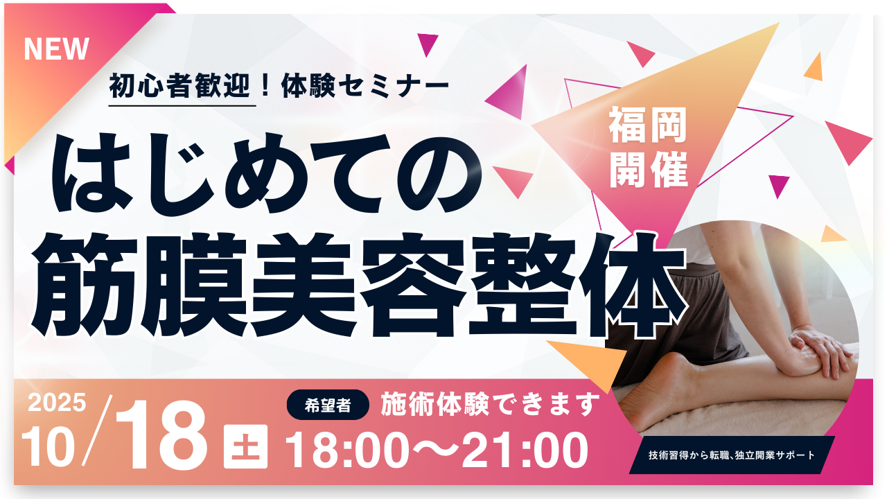 ★★★★★★★★★★★★★★★★★★★★★★★★★ 自由な働き方を実現できる美容技術 筋膜美容整体スクールは、美容のプロフェッショナルを育成する場であり、 同時にセラピストの未来を支える場所です ★★★★★★★★★★★★★★★★★★★★★★★★★ 【筋膜美容整体とは?】 巷で話題のオールハンドの筋膜リリース(DTMR®︎)を使った美容整体です。身体のなかにある筋肉や臓器を包んでいる「筋膜(きんまく)」という膜に対して手技でアプローチし、美容目的で身体や顔のゆがみ、バランスを整えていく整体施術です。身体や顔の歪みの原因となる硬く縮んだ筋膜を正常に整えることで、姿勢や歩き方の改善・ボディラインの整え・小顔効果・むくみの解消、見た目の痩身など、美しい見た目やスタイルを実現します。また、筋膜は痛みや不調にも深く関連しているので、美容効果と同時に、痛みや不調の改善効果も期待できます。 当スクールでは、生徒様や検討されている方から以下のようなご質問をいただくことがあります。 ・未経験だけど、チャレンジできますか? ・まず何から始めれば良いですか? ・どのコースを選べば良いか分からないです。 そんな声にお応えするために、初めての方でも気軽にご参加いただける体験セミナーを開催しています。 まず実際に体験していただくことで、この技術を身近に感じ、ご自身がやりたいことが見つかる方もいらっしゃいます。 ○体験セミナーとは? 筋膜美容整体についてもっと知りたい!体験してみたい!という方のためのセミナーです。 このセミナーでは、筋膜美容整体の理論、なぜ筋膜リリースは美容に効果的なのか、筋膜と美容と老化の関係などについて理解することができます。また、希望する受講生は実際の筋膜美容整体の施術を体験することができます。その他、筋膜美容整体の施術のポイントである、体を痛めない美容施術のポイントをお伝えしていきます。 ○主な内容 美容の鍵は「筋膜」 細胞レベルでの筋膜と美容&老化の関係 全解明!老化のメカニズムとその予防法 筋膜美容整体理論について 筋膜美容整体の施術デモ 筋膜美容整体の施術体験 体を痛めない施術法のポイント など 美容機器がなくても独立開業を実現できる、筋膜リリース(DTMR®︎)を使ったオールハンドの本格的な美容技術【筋膜美容整体】を学んで自由な働き方を手に入れませんか? https://shizenniutsukushiku.com/lesson25_05/