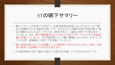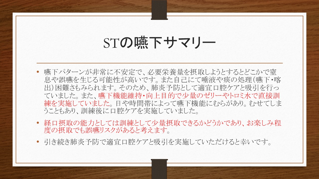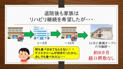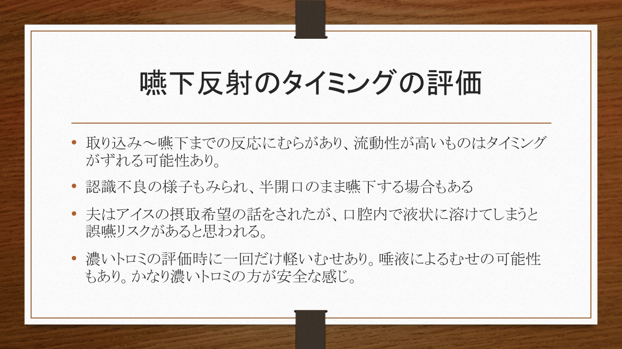 しっかりした嚥下評価を行うには、嚥下造影検査(VF)がゴールドスタンダードとされています。でも、次のような状況をよく経験しないでしょうか? たとえば、病院なら「さっき脳卒中で入院した患者さん、この血圧の薬を安全に飲めるかどうか、今診てほしいんだけど」、施設なら「あの胃ろうの患者さん、病院で食べたらダメっていわれて経口摂取していないけれど、何か少しでも食べるのは無理かな?」、在宅なら「病院ではペースト食でっていわれて退院してきたけど、本人が形のあるものを食べたいって言うんです。あのときよりは元気になった気がするけど今の状態はどうなんでしょうか?」など。 嚥下造影検査(VF)や嚥下内視鏡検査(VE)なしで評価・対応を求められることのほうが圧倒的に多いのが現実ですよね。 第1回で嚥下リハビリに必要な基礎知識や対応方法を見直し、第2・3回の「嚥下の見える評価をしよう! 頸部聴診法のススメ」で、頸部聴診法を活用した嚥下評価のポイントを学んでいただいた方は、この回で実践編を学んでいきましょう。 残念ながら、現場では病態を捉えることなく、単に「嚥下が弱いから、トロミ・ティースプーン1杯で」「飲み込みが悪いから誤嚥性肺炎のリスクが高く経口摂取は難しい」などと説明され、食事を禁止されたり、安全にという名のもとに変な回り道をさせられているケースを散見します。 適切な評価・対応ができないことにより、廃用症候群が進み、本当に食べられない状態、誤嚥性肺炎リスクの高い状態へと陥ってしまうのです。マニュアル通りにスクリーニングテストを行って嚥下評価の有無だけ判断していてもそこから先には進めません。 現場でよく経験するようなケースをたくさん取り上げながら、現場目線での評価・対応を分かりやすくお伝えしていきます。頸部聴診法を活用し、「3つの嚥下機能」のなかでも「咽頭クリアランス」と「嚥下反射のタイミング」を把握することが最も大切です。そのうえで「咀嚼・食塊形成~送り込み」を把握すれば、適切な食形態も検討することができるのです。症例の動画を供覧しながら、評価ポイントに沿って自分で考えアウトプットすることで実践力を高めていきましょう!