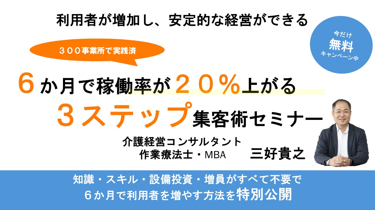 三好貴之 介護経営コンサルタント・作業療法士・MBA 13年前からコンサルティングと並行して、通所介護を経営。しかし、コロナの流行で利用者が激減し、大幅な赤字に転落。先の見えない中、スタッフとの関係も悪化し、スタッフの半分が一気に退職して絶体絶命のピンチに。 そこから、今まで自分の作業療法士としての現場実践と15年間で300事業所のコンサルティングをMBAで学んだ知識で「稼働率を20%上げる6つのステップ」をまとめ上げ、実践したところ、一気に稼働率が30%アップ。 さらに、コンサル先でこの6つのステップを実践したところ 「これはスキルに頼らず、誰でもできる!」 と稼働率アップとスタッフの職員、利用者満足アップの成功事例を連発。 また、「利用者のために、1つでも多くの良い介護施設を作りたい!」との思いで、通所経営のすべてをワンストップで学べる「通所アカデミー」を開始。 6か月のオンライン講座でグループコンサルティングを実施したところ、 「さすがコンサルタントの視点」 「この集客方法は目からウロコ」 「ものすごく分かりやすい」 「MBAって難しそうと思っていたけど、 これならできる!」 など好評を博し、受講生の95%が20%以上の稼働率アップに成功している。