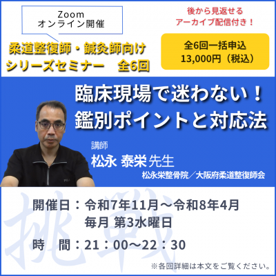 ⋱\柔道整復師・鍼灸師の方、必見!/⋰ 臨床現場で迷わないための鑑別ポイントと 対応法が学べる全6回のシリーズセミナー! 本セミナーでは、柔道整復師や鍼灸師が 現場で多く遭遇する疾患への対応力を高めるため、 解剖学の基礎から評価・処置・後療法までを 段階的に学び、実践力の向上を目指します。 知識と技術の習得はもちろん、 保護者などへの説明力・伝え方の工夫も重視し、 患者さんとの信頼関係構築にもつながる、 臨床対応力を総合的に高める内容となっています。 ◎第6回セミナー概要 本セミナーでは、腰痛と股関節障害に対する 解剖学的理解や鑑別の重要性を学びます。 腰と股関節は密接に関連し 症状が似ているケースも多いため、 正確な判断と対応が求められます。 基礎から後療法までを体系的に整理し、 臨床現場で信頼される施術者を 目指すための知識と技術を習得します。