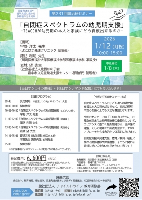 第231回国治研セミナー「自閉症スペクトラムの幼児期支援‐TEACCHが幼児期の本人と家族にどう貢献出来るのか‐」 TEACCHセミナーでは長年にわたり、梅永雄二先生(早稲田大学)にコーディネーターを担当していただいていました。 今年度からは梅永先生のたっての希望により宇野陽太先生(よこはま発達クリニック)をコーディネーターにお招きし、装いも新たに開催いたします。 今年のTEACCHセミナーでは宇野洋太先生に加え、諏訪敏明先生(川崎医療福祉大学)、岩城望先生(社会福祉法人北摂杉の子会)を講師にお迎えします。 自閉症スペクトラムの子ども達への幼児期支援は本人の将来だけでなく、家族の理解や安心を築くうえでも大切な基盤となります。 本セミナーでは、「TEACCHプログラム」の理念を踏まえた幼児期支援の重要性について、エビデンスに基づく最新知見から、全体像の理解、そして現場での実践方法まで、3つのアプローチから多角的かつ体系的に学びます。 自閉症支援や発達支援、療育/教育/福祉に携わ関係者様や保護者様、子供に係る皆様にぜひご参加いただきたい内容となっています。 【日時】 2026年1月12日(月・祝) 10:00-15:00 ※当日聴講が難しい方はご相談ください。 【講師】 宇野洋太先生(よこはま発達クリニック 副院長) 諏訪敏明先生(川崎医療福祉大学医療福祉学部医療福祉学科 准教授) 岩城望先生(社会福祉法人北摂杉の子会) 【プログラム】 10:05-10:50 「自閉症スペクトラムの幼児期支援‐エビデンス編‐」宇野洋太先生 11:00-12:00 「自閉症スペクトラムの幼児期支援‐総論編‐」 諏訪敏明先生 13:00-14:00 「自閉症スペクトラムの幼児期支援‐実践編‐」岩城望先生 14:10-15:00 質疑応答 総括まとめ 【講義】 Zoomによるオンライン受講+後日オンデマンド配信 【受講料】 6600円 ※過去に国治研セミナー/リバティ・インターナショナル海外視察研修に参加されたことのある方は-1000円で受講可能です。