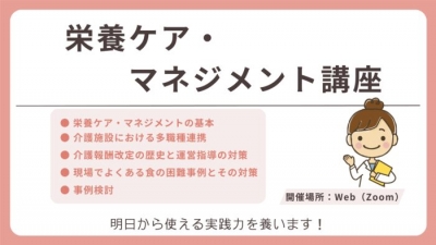 本講座は栄養ケア・マネジメント入門・初級講座です。 栄養ケア・マネジメントの手法を基礎から学ぶとともに、厚生労働省の様式例に沿って書類作成方法(各種加算算定対応を含む)、介護報酬や運営指導対策についても解説します。 現役で活躍中の講師によるリアルな困難事例とその対策法や事例検討により、スキルアップを目指せます。 特 徴 ○全国どこからでも参加可能です! ○対面での講義の内容を網羅しています。 ○質問は、チャット機能や音声でも可能です。 ○人との距離や参加者を意識することなく、リラックスして受講できます。 ○セミナー会場の施設環境(座る場所の違いや温度など)に集中力を阻害されることがありません。 ○講師の実体験をもとに症例検討や監査対策をレクチャーします。 内 容 1.栄養ケア・マネジメントについて 2.介護施設における多職種連携について 3.介護報酬改定の歴史と運営指導への対策について 4.現場でよくある食の困難事例とその対策 看取りケア、摂食嚥下障害、認知症等 5.事例検討(グループワーク) 開催日時 2026年5月17日(日)10:00~15:00(うち休憩1時間) 回線の接続開始は9:30~ 開催場所 Web(Zoomを利用したライブ配信) ※通信料は、受講者様の負担となります。 Zoomの使用が初めての方は、事前に接続テスト(音声・カメラ)をご依頼ください。 当日のお客様都合によるシステムトラブルは、対応いたしかねますのでご了承ください。 ZoomのURLは、振り込みが確認できた後、講座開催日の3営業日前にお送りいたします。 受講料 8,800円(税込) ※セミナー価格を改定しました(詳細はこちら) テキストを郵送でご希望の場合は1講座につき1,100円(税込)プラス(開催日1週間前に振込確認ができた方に限る) 生涯教育単位 栄養ケアプランの作成 演習1単位 ※画像オンにてご参加された方で、申請者にのみ付与させていただきます。